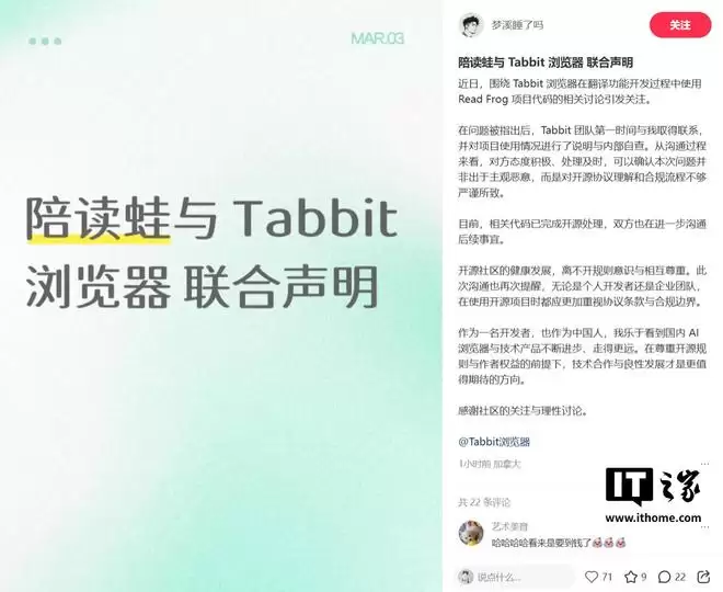 IT之家注意到,“陪读蛙”原作者对此表示,近日,围绕Tabbit浏览器在翻译功能开发过程中使用Read Frog项目代码的相关讨论引发关注。在问题被指出后,Tabbit团队第一时间与我取得联系,并对项目使用情况进行说明与内部自查。从沟通过程来看,对方态度积极、处理及时,可以确认本次问题并非出于主观恶意,而是对开源协议理解和合规流程不够严谨所致。目前,相关代码已完成开源处理,双方也在进一步沟通后续事宜。