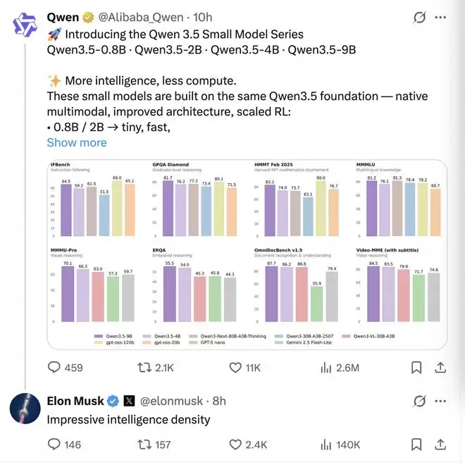 但就在3月2日晚,当阿里千问开心3.5系列旗下4款小尺寸模型后,马斯克旋即在社交媒体留下了一句辣评: "Impressive intelligence density."(令人惊叹的智能密度)