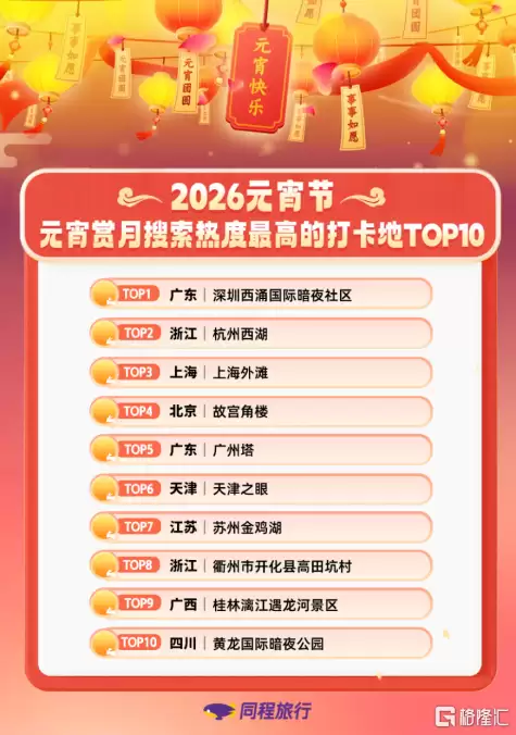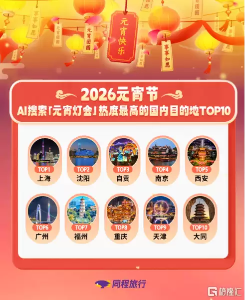 同程旅行数据显示,综合灯会搜索热度和门票预订热度,元宵节当天,国内出游热度最高的十大热门主题灯会为:第32届自贡国际恐龙灯会(自贡)、第40届秦淮灯会(南京)、2026年上海豫园灯会、2026年粤港澳大湾区灯会(广州)、2026大同古都灯会、2026沈阳千灯会、第24届“两马同春闹元宵”灯会(福州)、2026年重庆新春灯会、2026天津国际灯会、2026长安灯会(西安)。