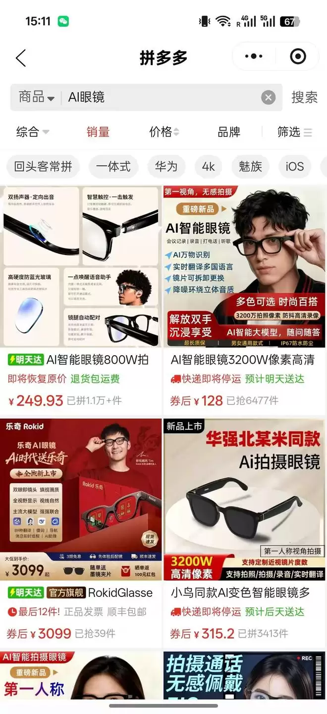 与此同时,拼多多等电商平台上的白牌智能眼镜,也用更低的产品价格围攻头部眼镜品牌。洛图数据显示,白牌及中小厂商在线上市场占据了约一成的份额。得益于国内高效的供应链,白牌眼镜在拼多多等渠道以低价大量获客。