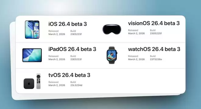 苹果今天凌晨向参与测试的设备推送了iOS 26.4 Beta 3开发者测试版更新,同时到来的还有iPadOS、tvOS、visionOS、watchOS的最新测试版本。