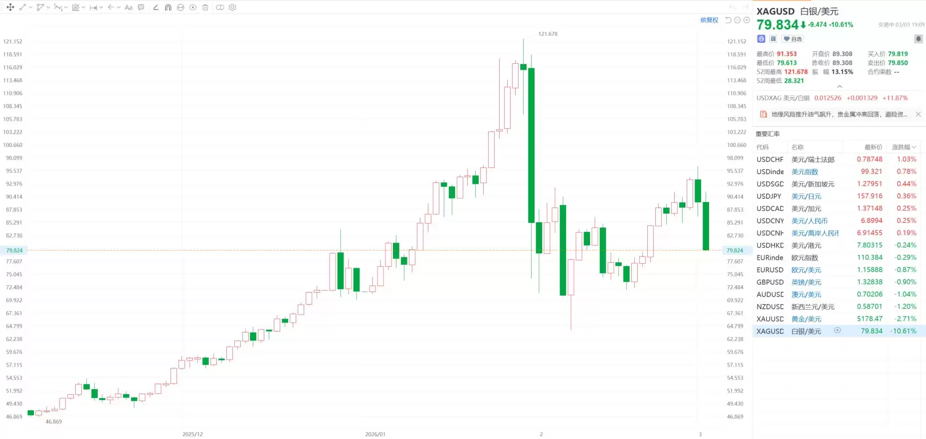 3月3日,现货白银持续下挫,日内暴跌10%,现报每盎司80.28美元。现货黄金短线跳水近100美元,失守5170美元/盎司,日内跌幅达2.94%。