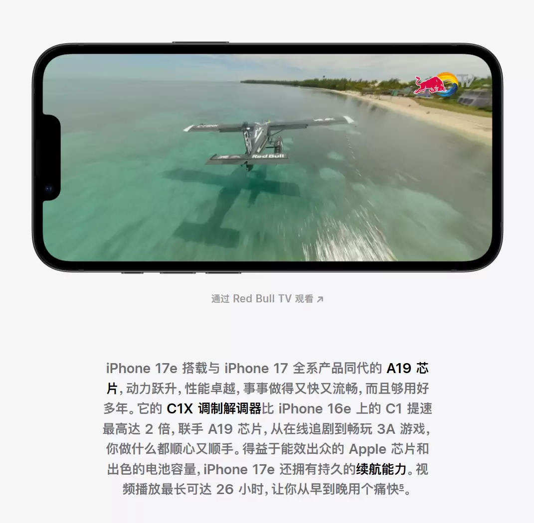 这款新iPhone的入门型号搭载了与iPhone 17同款的A19芯片,不过和上一代一样,在GPU部分再次进行了精简,核心数量缩减至4个。CPU方面则保持一致。在基带方面,iPhone 17e还配备了与iPhone 17 Air同款的自研C1X基带,相比早期的C1版本,传输速度提升了一倍。