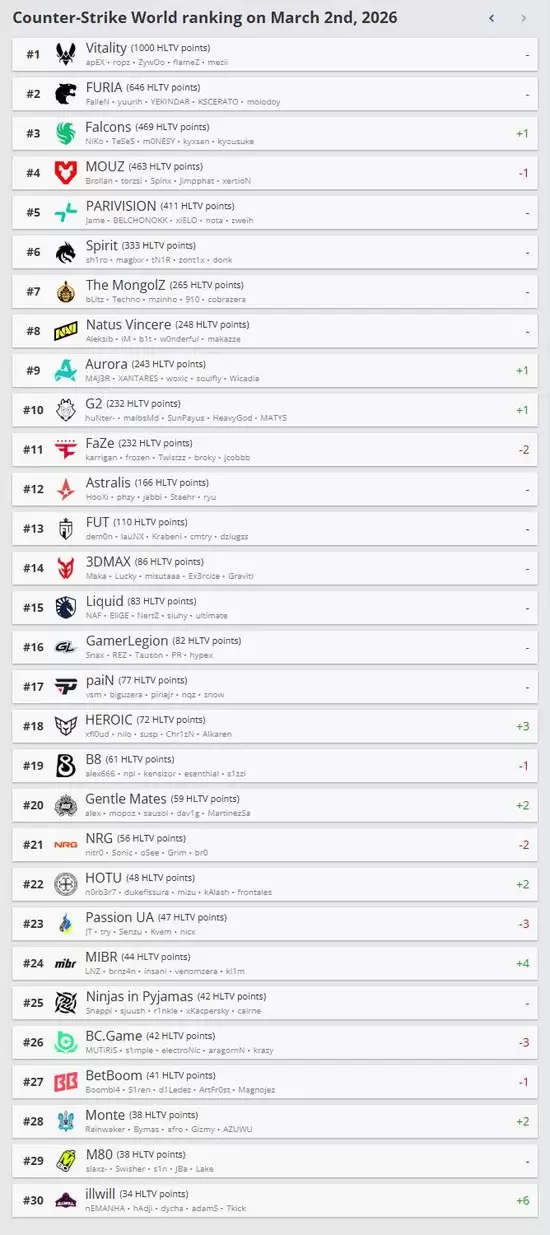 第11至20名区间迎来了多位“新面孔”,从上方跌落的FaZe占据第11位。同时,HEROIC与Gentle Mates凭借近期预选赛的出色战绩,分别从第21、22名跃升进入前二十,目前位列第18和第20。B8则小幅下滑一位至19。相对的,NRG和Passion UA因状态下滑,从本区间跌落至21名开外。