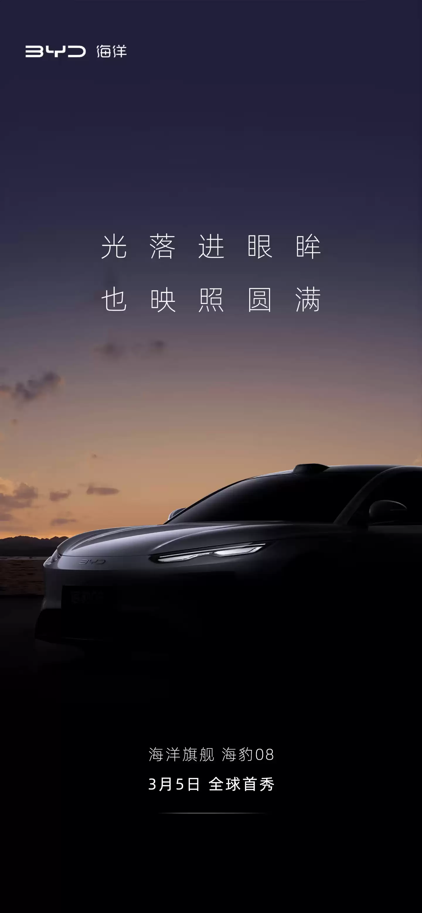 比亚迪海洋网即将迎来一位全新成员——海狮08。这款旗舰级轿车近日发布了预告图,并宣布将于3月5日正式开启全球首秀。作为比亚迪在新能源领域的又一力作,海狮08不仅在设计上独具匠心,更在技术层面实现了多项突破。