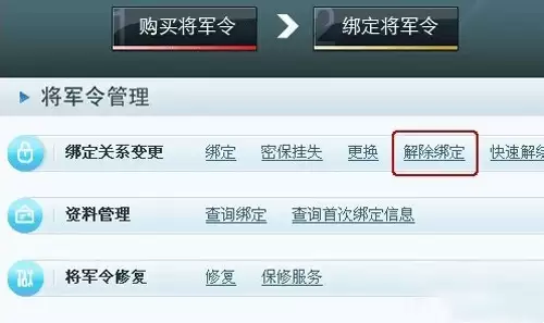 但如果你的账号正处于锁定状态,就无法使用“快速解绑”功能了。这时,玩家朋友需要登录指定页面,进行“解除绑定将军令”的操作,具体步骤可以参考以下说明:
