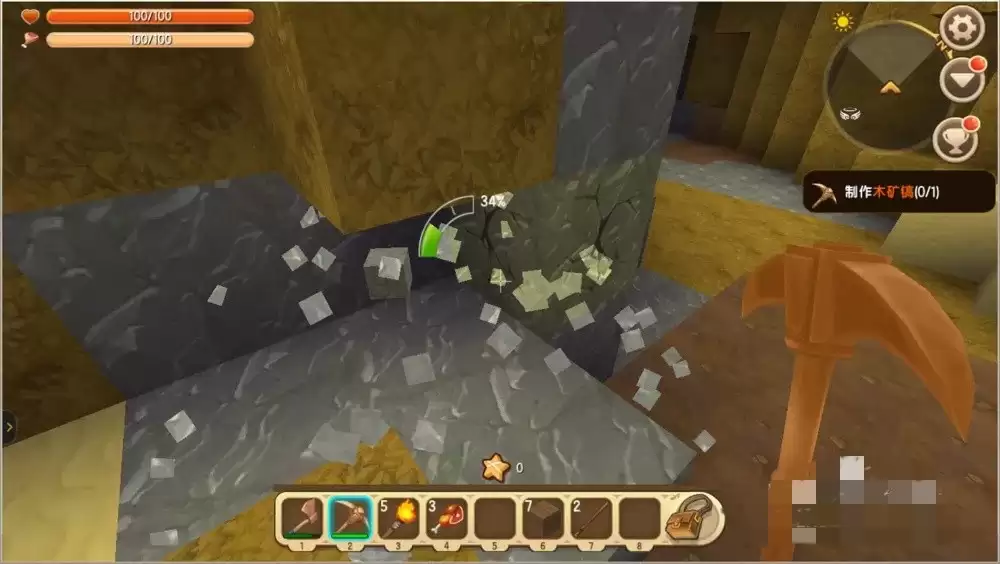 开局自带一把小木镐,这是用来采集岩石的。收集到2块岩石后,与2根小木棍一同制作成石矛。