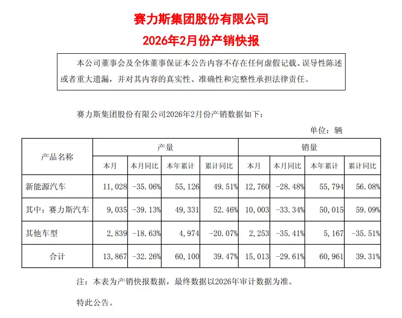 春节假期对汽车市场的季节性影响在赛力斯最新发布的产销数据中得到印证。根据2月产销快报,其新能源汽车销量为12,760辆,同比下降28.48%;产量为11,028辆,同比下滑35.06%。这一波动与行业普遍规律相符,但并未影响企业长期战略布局的推进。