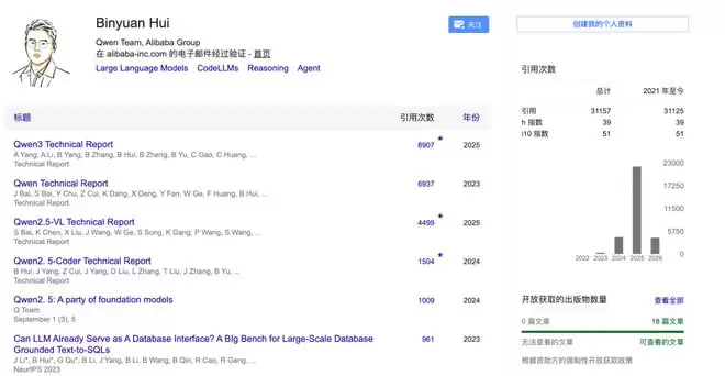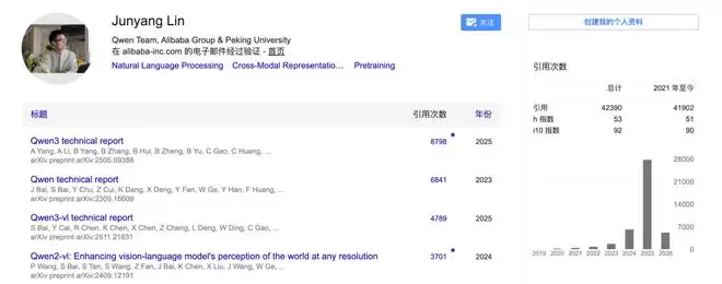 从Google Scholar中可以看出,他曾参与Qwen基础模型、编码模型多项训练和研发,被引数超3万。