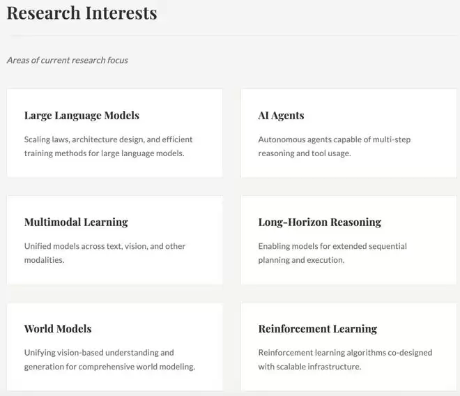 他的目标是构建自主编程模型,个人研究兴趣包括:基础模型、推理模型、编程智能体、计算机操控智能体。