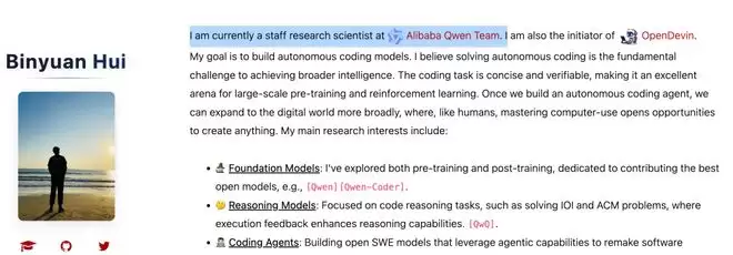 Binyuan Hui曾是Qwen团队的资深研究科学家,也是OpenDevin项目的发起人。