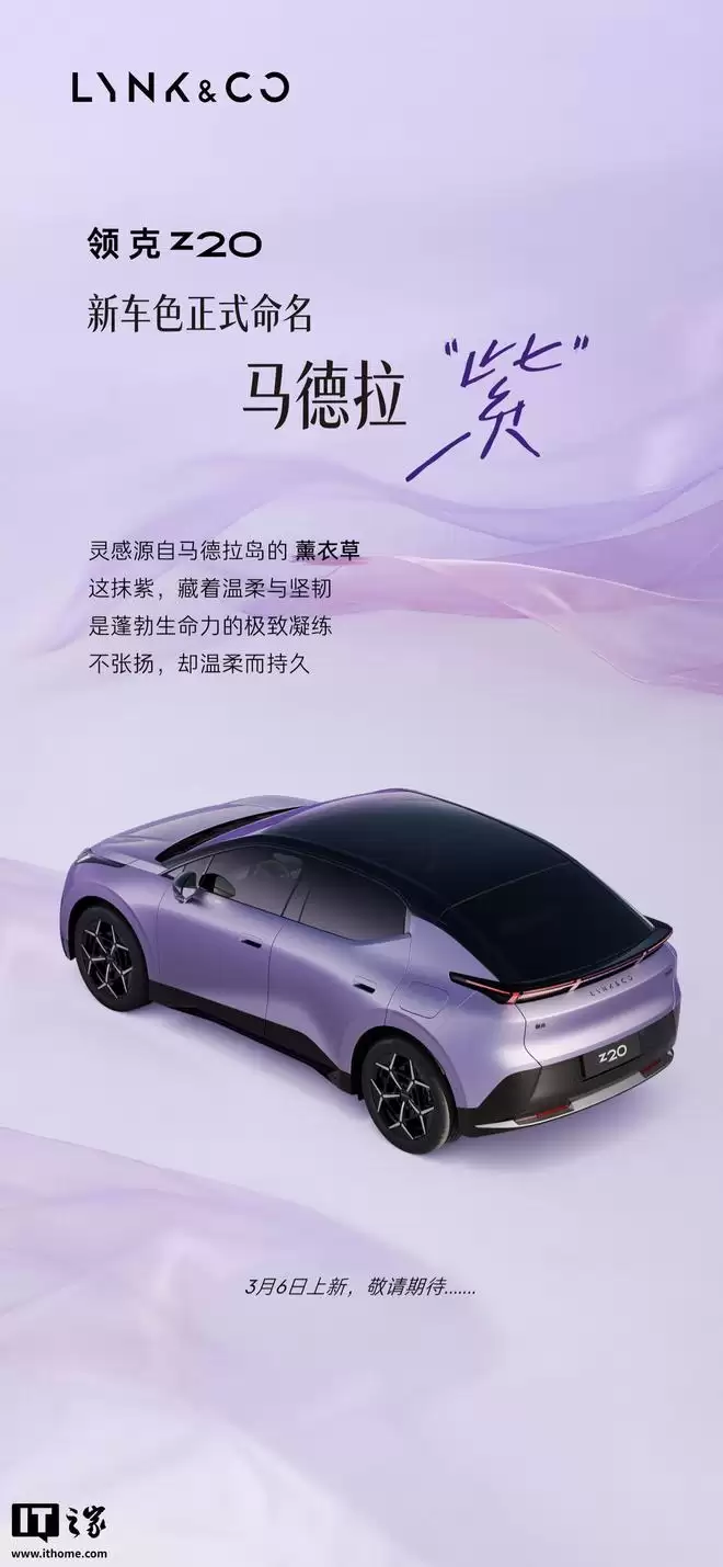 3月4日,IT之家报道称,领克汽车正式公布了全新Z20车型的命名——"马德拉紫"。这一独特配色的灵感源自大西洋马德拉岛上盛开的薰衣草,新车预计将在3月6日正式亮相。