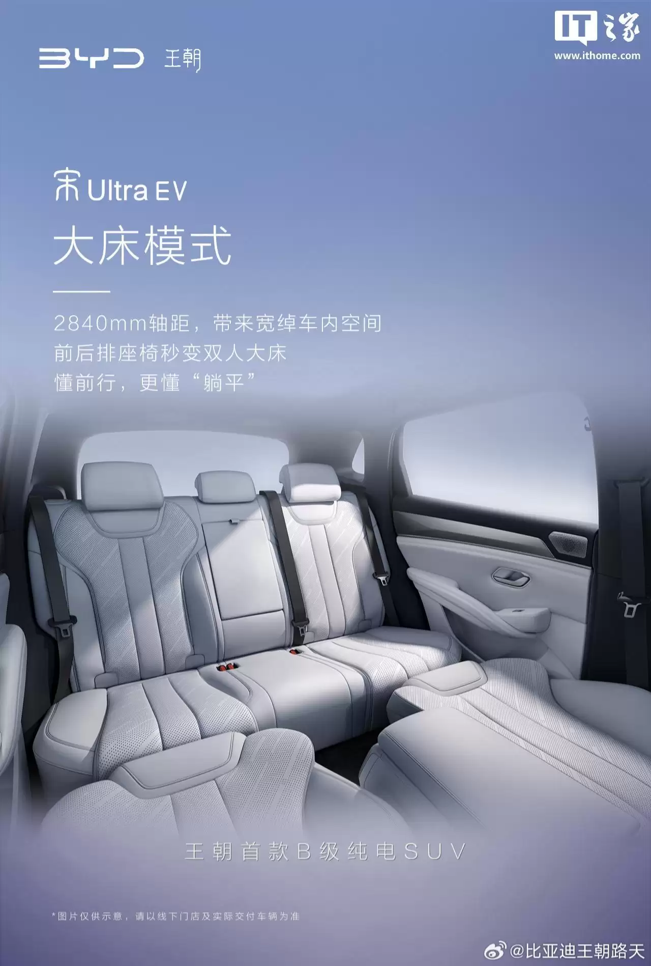 新车中央扶手处配备有双手机无线充电板(预计可提供50W无线充电功率)、置物杯架等,并保留了物理按键和旋钮。宋Ultra EV的轴距达到2840毫米,支持前排座椅放倒,官方宣称可实现“前后排座椅秒变双人大床”。