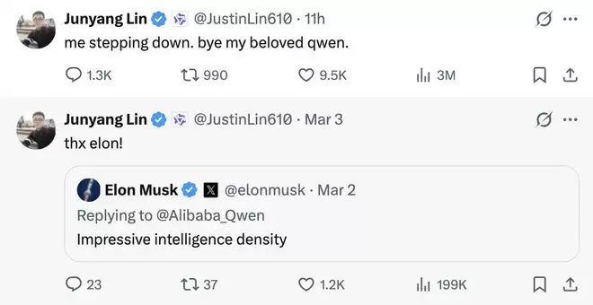 2月16日除夕夜,阿里开源了新一代千问大模型Qwen3.5,该模型实现了模型架构的创新,3月2日晚,阿里巴巴再开源千问3.5系列模型,引发特斯拉CEO埃隆·马斯克在社交平台对该系列模型评论,称赞其“智能密度令人印象深刻”,值得一提的是,林俊暟自宣卸任的前一条动态便是转发马斯克评论并表示感谢。