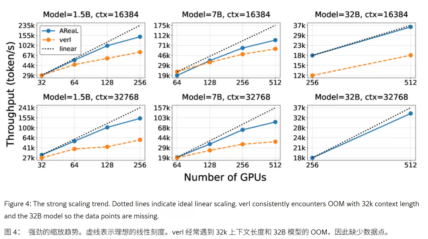 在算法层面,AReaL面临异步带来的数据"陈旧度"挑战,即训练数据可能来自旧版本的模型。为此,团队设计了陈旧度感知训练机制,通过控制工作负载来平衡数据的新鲜度。