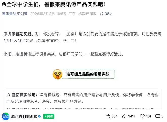 据了解,目前该推文已对标题内容进行了调整,将原先的“全球中学生暑假来腾讯当产品经理吧”改为“全球中学生暑假来腾讯做产品实践吧”,同时把原文中“来腾讯‘上班’”的表述更新为“来腾讯暑期实践”。公告补充说明,这是专为中学生设计的暑期实践活动,核心内容包括参观学习、互动交流、沉浸式体验和实践探索等环节。该项目并非企业招聘性质的实习计划,不涉及任何职场实习录用、上岗等安排。