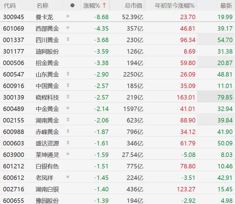 A股异动黄金股回调:曼卡龙跌超8%,西部黄金跌逾4%