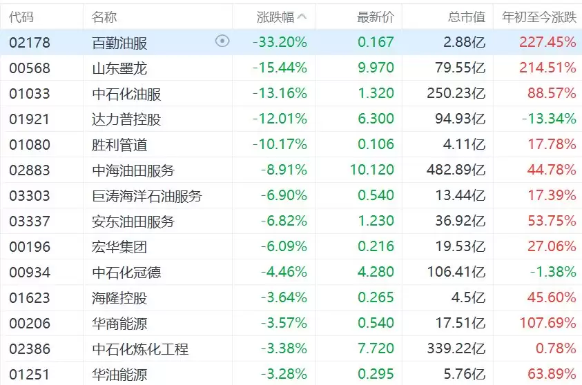 港股油气设备与服务股连涨两日回调,百勤油服跌超33%