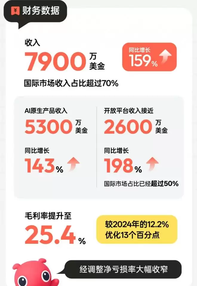 2025年,MiniMax实现总收入约7903.8万美元,同比增长158.9%;经调整净亏损2.5亿美元,经调整净亏损率较上年同期大幅收窄;毛利率由 2024 年的 12.2% 提升至 25.4%。