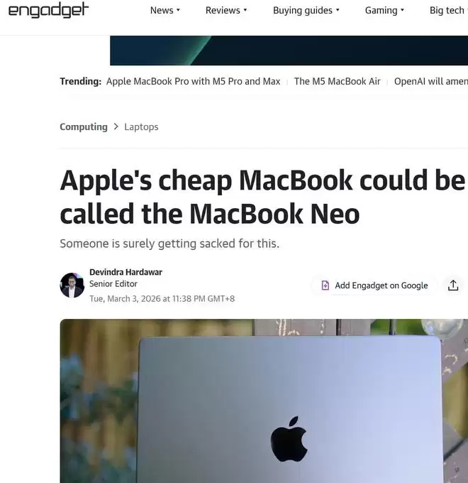 【环球网科技综合报道】3月4日消息,据engadget与MacRumors报道,在连续两日的新品发布浪潮后,苹果公司不仅正式推出了搭载M5系列芯片的MacBook Air与MacBook Pro,其官网一则短暂出现的监管公告意外揭示了备受期待的入门级笔记本电脑名称——MacBook Neo,预示着苹果首款主打高性价比的MacBook笔记本电脑已准备就绪,预计将于3月5日正式发布。