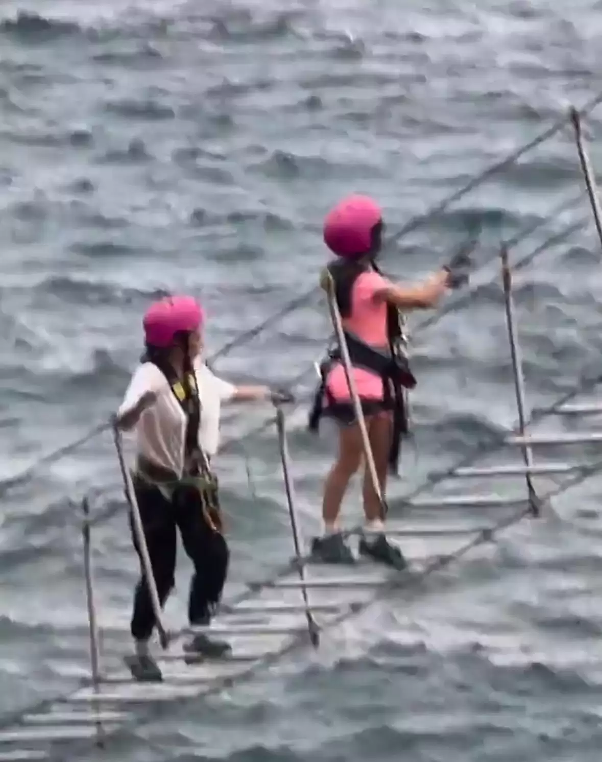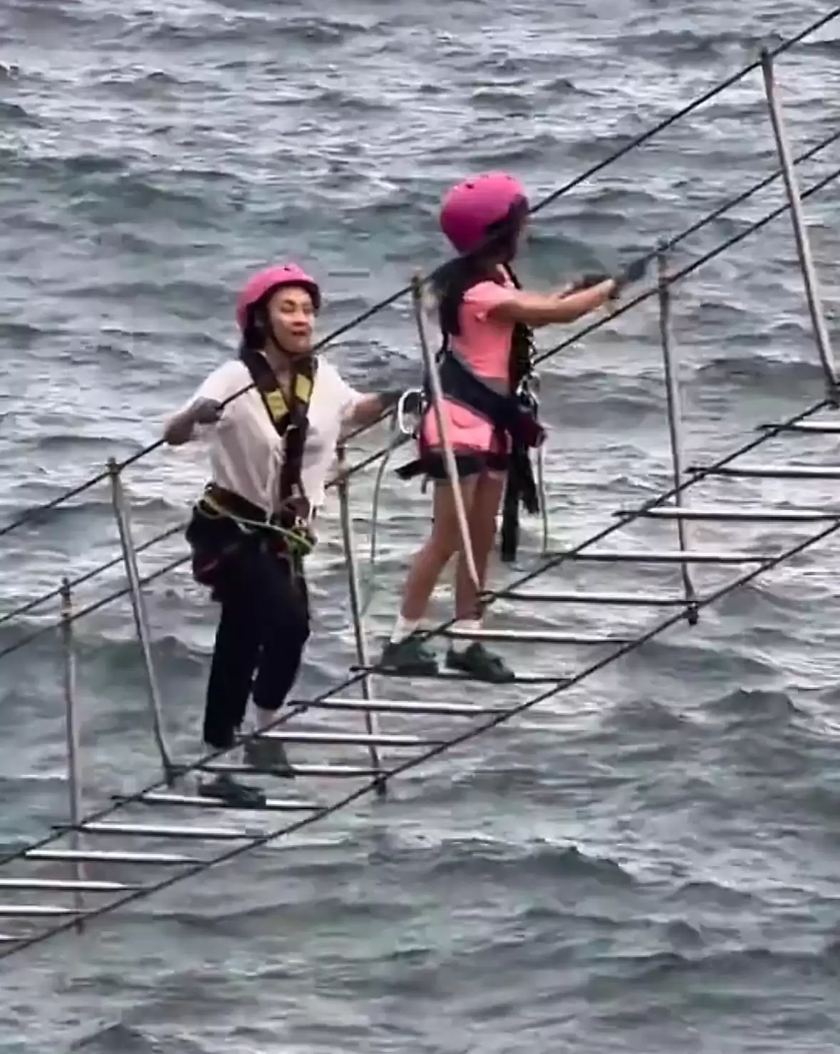 乘坐轮渡抵达景区后,章子怡就和女儿“醒醒”戴上了专业的攀岩设备。母女俩小心翼翼地踩着木板往前走,脚下就是深不可测的大海。海面激起朵朵波纹,看上一眼就令人心生畏惧。