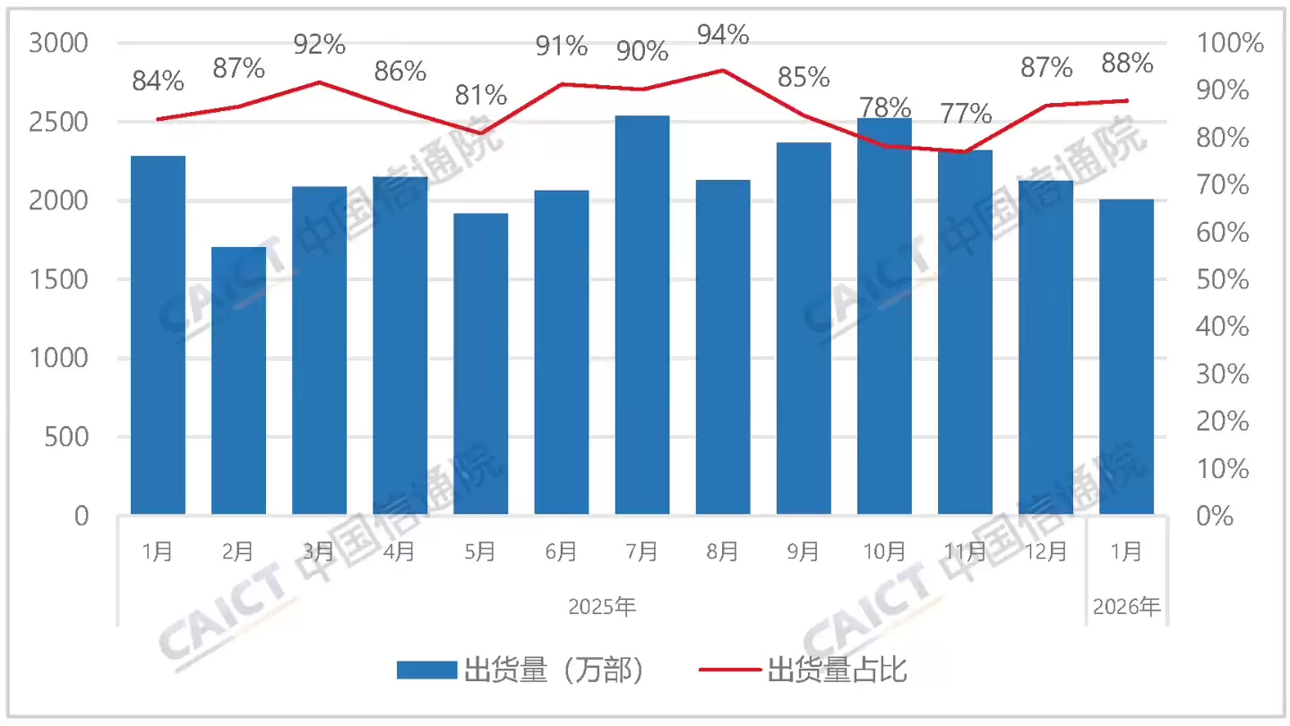 近日,中国信息通信研究院公布了2026年1月国内手机市场的最新数据。报告显示,当月国内手机市场整体出货量为2286.6万部,较去年同期下降了16.1%。其中,国产品牌手机的表现依然亮眼,出货量达到2007.4万部,同比下降12.1%,占据了87.8%的市场份额。
