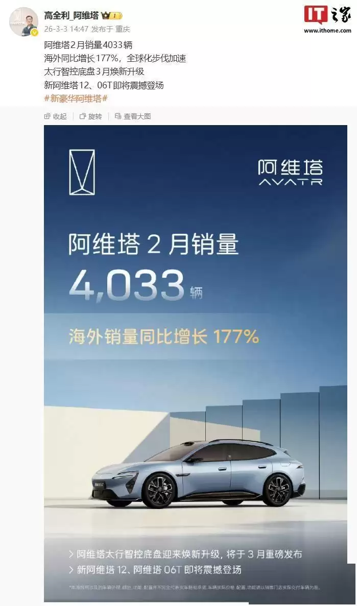 阿维塔近日披露了最新的市场动向与产品规划。数据显示,该品牌在2月份销量达到4033辆,海外市场同比激增177%,全球化战略布局持续深化。这一亮眼成绩的取得,既得益于现有产品在市场上的稳健表现,也离不开即将推出的新品与技术升级带来的强劲动力。