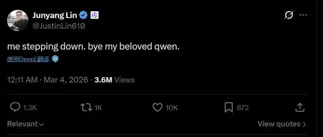 3月4日凌晨,千问技术负责人林俊旸在X平台发了一句话:"me stepping down. bye my beloved qwen。"(我卸任了。再见了,我挚爱的千问。)该帖子目前获超1万次点赞、1300余条评论,累计阅读量快速突破360万次,成为当日全球AI领域关注度最高的事件。