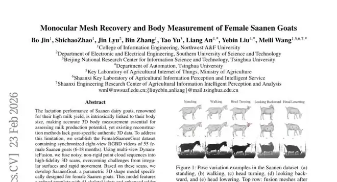 这项由西北农林科技大学信息工程学院牵头,联合清华大学自动化系、南方科技大学等多个研究机构完成的突破性研究,发表于2026年2月的arXiv预印本平台(编号:arXiv:2602.19896v1)。研究团队首次建立了专门针对雌性萨能奶山羊的完整3D数据集和参数化模型,实现了仅凭单张RGBD图像就能精确重建羊的3D形状并自动测量关键身体尺寸的技术突破。