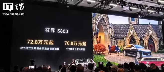 尊界 S800配备了896线双光路图像级激光雷达,价格为72.8万元起;其192线激光雷达版本,起售价则为70.8万元。
