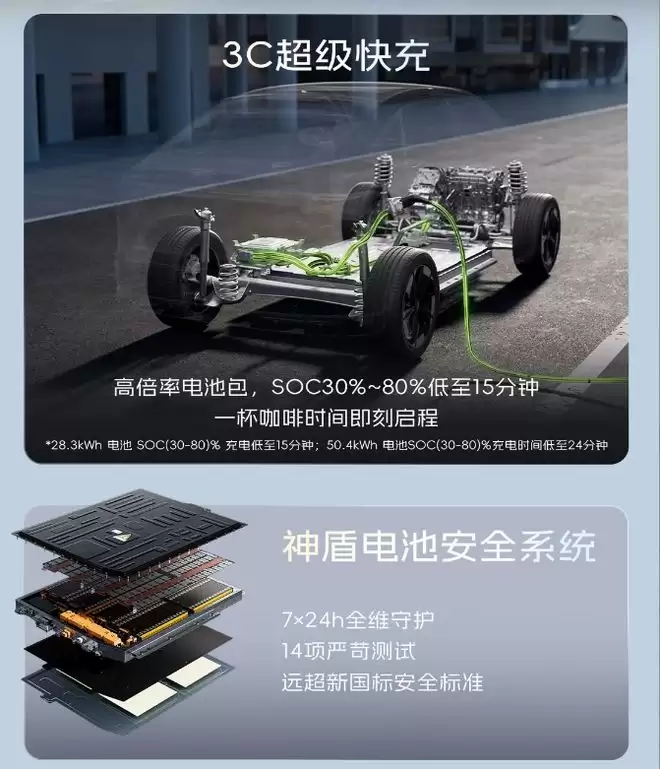 再次,超安全,超快充:配备3C超级快充,50.4KWh容量电池,SOC30%~80% 低至24分钟;神盾电池安全系统远超新国标;即便在-30℃深寒、50℃高温等极端温区,充电依旧稳定,6KW超大功率放电的功能,可满足更多使用场景;