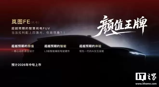 岚图FE(代号)主打颜值,号称“超越预期的智慧纯电FUV”,拥有原创设计、L3级智能辅助驾驶硬件、AI交互座舱,预计2026年中上市。