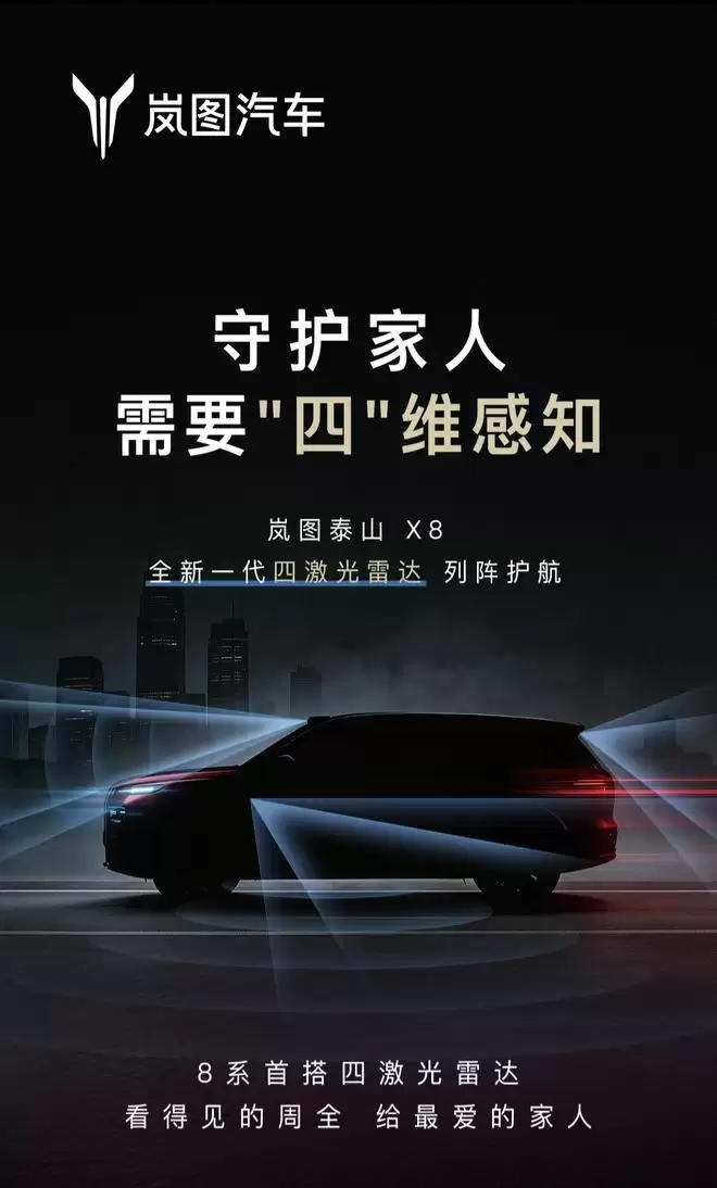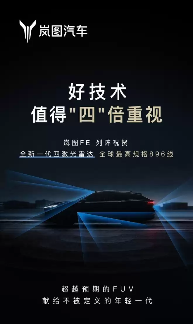 最新文案中出现了“四”这一关键词,预告图中的剪影也呈现多道光束,暗示旗下新车将搭载与尊界S800、问界M9同款的四激光雷达系统。值得一提的是,此次还曝光了岚图另一款全新车型——“超越预期”的FUV,专为“不被定义的年轻一代”打造的岚图FE。