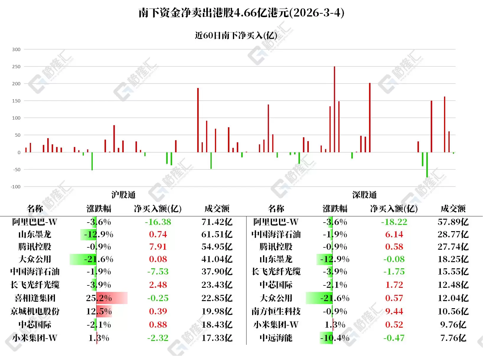 据统计,南下资金已连续4日净买入腾讯,累计达54.2201亿港元;连续4日净买入南方恒生科技,累计达75.19亿港元;连续3日净卖出阿里巴巴,累计达60.57亿港元。