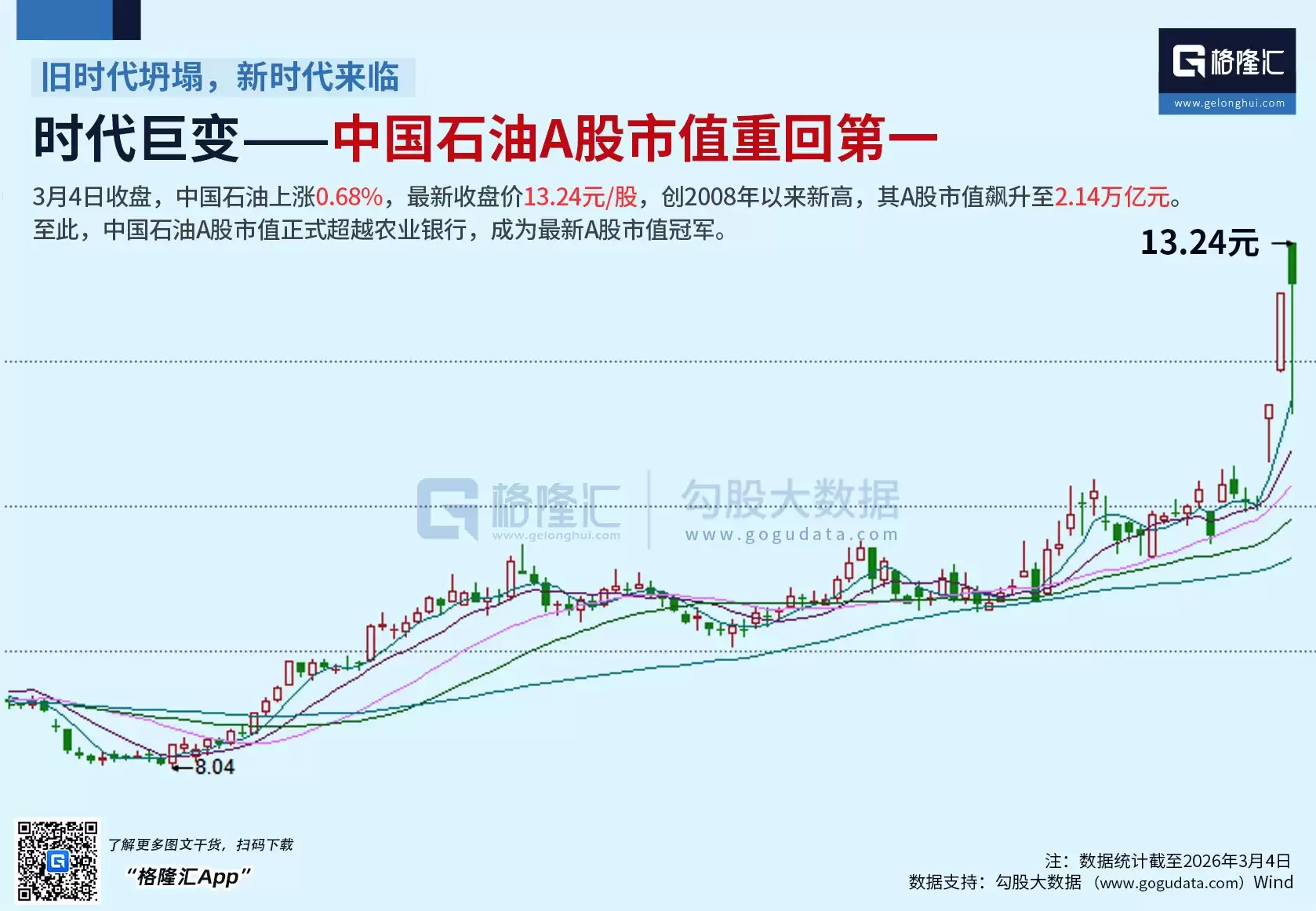 在连续两日罕见涨停之后,中国石油今日收盘再度上扬0.68%,报收13.24元,创下自2008年以来新高,其A股总市值已飙升至2.14万亿元。至此,中国石油A股市值正式超越农业银行,成为A股市场新晋市值冠军。