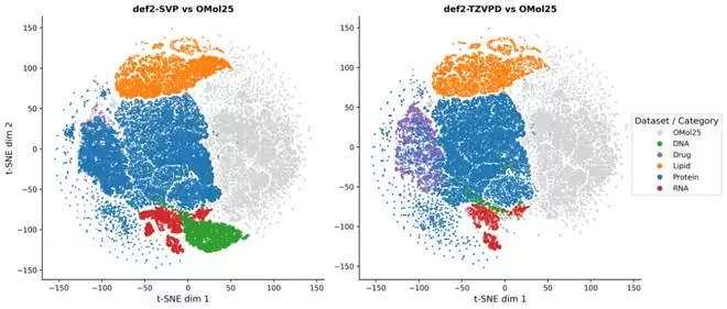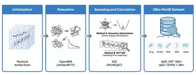 数据构造上,UBio-Mol26 采用「bottom-up 枚举 + top-down 采样」的混合路线:bottom-up 系统枚举氨基酸短肽、核酸片段与脂质单元以保证基础构件覆盖;top-down 从真实蛋白结构抽取局部环境并进行溶剂化与化学封端,以增强对生物场景几何与相互作用模式的覆盖。团队还给出了与 OMol25 的分布对比(t-SNE 可视化,t-SNE 为常用降维可视化方法),用于说明两套数据在特征空间中的互补关系。