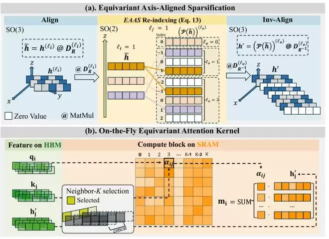 UBio-MolFM 采用 E2Former-V2(线性扩展的等变 Transformer),以「节点中心、硬件友好」的实现减少稀疏边操作、提升内存局部性,从而降低大体系推理开销;同时通过 EAAS 稀疏化降低 SO(3) 张量积开销,并结合 LSR 长短程建模同时处理局部相互作用与远程耦合。