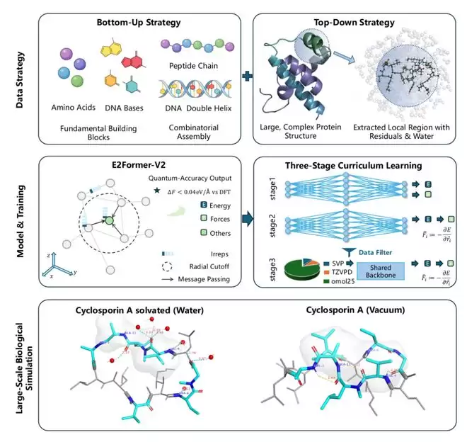 在药物研发、蛋白构象研究、核酸功能解析等领域,分子模拟是理解生命过程的重要工具,但长期受制于「尺度-精度」矛盾:高精度量子化学方法往往只能覆盖数百原子,而更可扩展的经典力场又难以刻画复杂分子作用与非局部效应。即便机器学习力场显著提升了精度,在真实生物大分子场景仍常被三类问题卡住:公开数据以小分子为主、显式溶剂与大体系样本稀缺;长程相互作用难以被完整建模;以及大体系推理吞吐不足,难以进入稳定可用的工程流程。