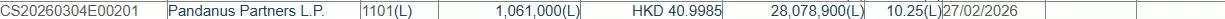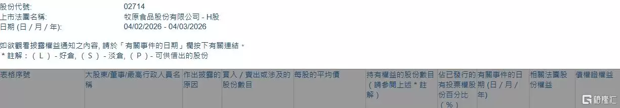 根据联交所最新权益披露资料显示,牧原股份于2026年2月27日获得Pandanus Partners L.P.在场内以每股均价40.9985港元增持106.1万股,涉及资金约4349.94万港元。