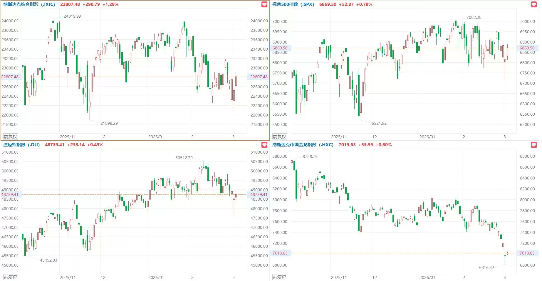 3月5日,美国股市三大指数全线飘红。纳斯达克综合指数表现尤为强劲,上涨1.29%;标普500指数紧随其后,攀升0.78%;道琼斯工业平均指数也稳健上扬0.49%。盘面上看,大型科技股多数走强,成为市场的主要驱动力。其中,英特尔股价大涨超过5%,亚马逊和特斯拉的涨幅也均超过3%。与此同时,Meta与英伟达的股价上涨逾1%,微软与奈飞同样录得小幅上涨。不过,苹果和谷歌股价则出现轻微回落。