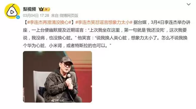 3月4日,李连杰在讲座现场一开场就直奔主题,高调澄清围绕他健康状态的种种谣言。针对最骇人听闻的“更换心脏”说,他直言不讳:“我没病,也没换心脏。”并给出了一个无法反驳的医学逻辑——换心脏的前提是器官病变,而自己心脏健康,根本无需更换。