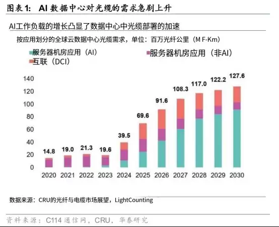 2025年,全球光纤总需求预计同比增长4.1%,增长平稳;然而,其中数据中心领域的光纤需求增幅则高达75.9%,呈现爆发态势。结构性变化更为显著:根据CRU数据,AI相关光纤需求占比将从2024年的5%激增至2027年的30%。届时,全球数据中心光纤年需求总量预计将达8.8亿芯公里。