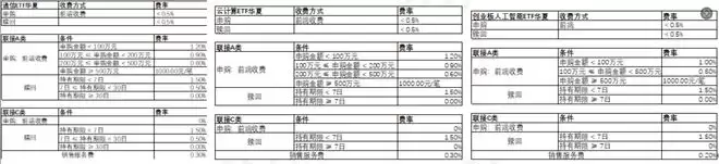 注:以上所提及ETF均不收取申购费、赎回费、销售服务费,申购赎回代理机构可按照不超过0.5%的标准收取佣金,其中包含证券交易所、登记结算机构等收取的相关费用。此外,相关ETF及联接的管理费率和托管费率如下所示: