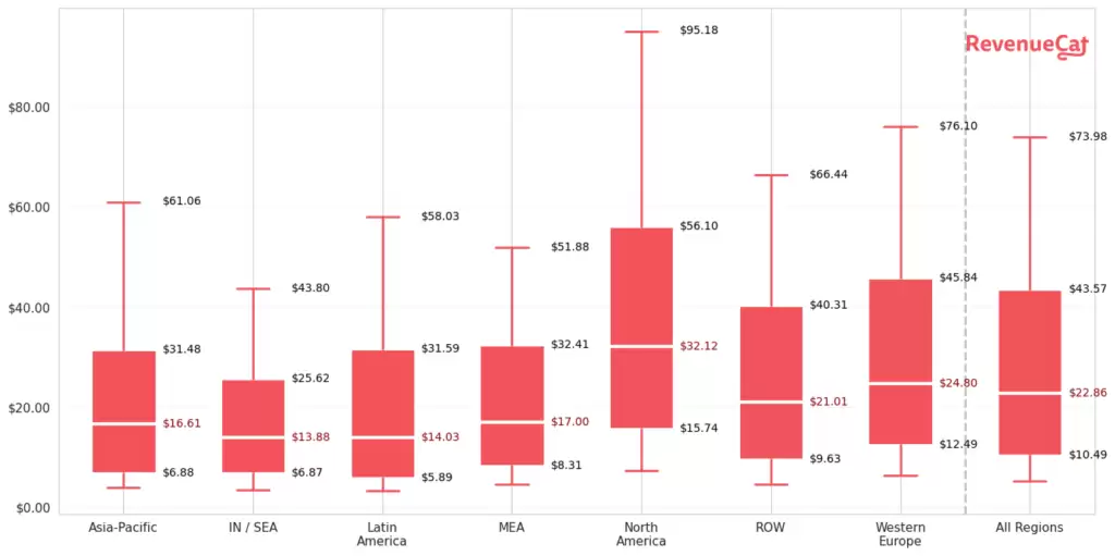 在定价策略上,高价与低价应用展现出截然不同的商业模型。高价应用创造了极高的单客收益,其首年用户生命周期价值中位数达到62.19美元,几乎是低价应用(10.69美元)的6倍。中等定价的应用则表现平庸,LTV仅为26.07美元。