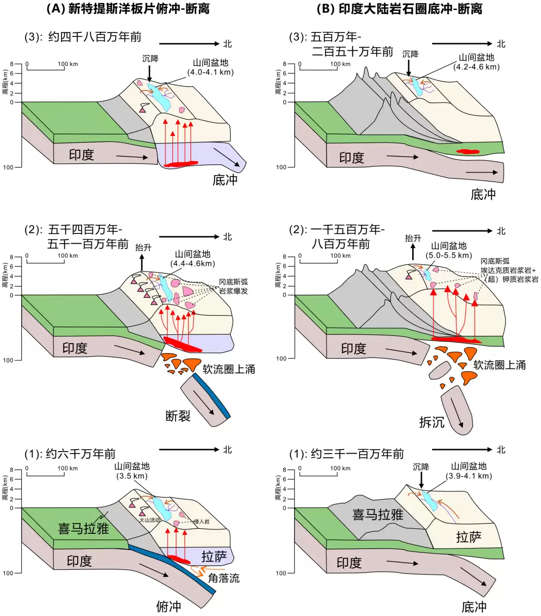 研究提出,第一次抬升是由俯冲的新特提斯洋板块断离引发的,第二次则是印度大陆岩石圈底冲(即水平俯冲)后的拆沉作用。而每次断离或拆离后的大陆岩石圈持续底冲作用,又像一只向下拖拽的手,导致地表沉降。