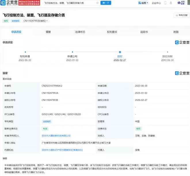 企查查APP信息显示,近日,深圳市大疆创新科技有限公司公布了一项名为"飞行控制方法、装置、飞行器及存储介质"的专利。