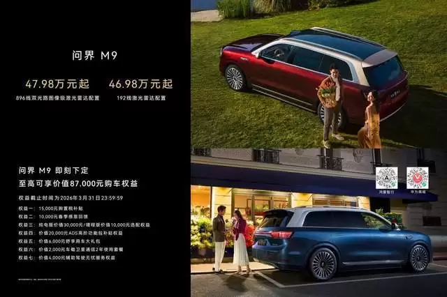 搭载全新一代激光雷达的问界M9,已于2026年3月4日开启预定,建议零售价47.98万元起,即刻下定,至高可享价值87,000元购车权益,权益截止时间为2026年3月31日23:59:59。