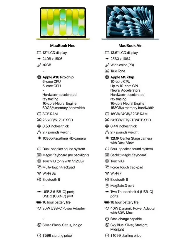 如果把 Neo 与最新 MacBook Air 放在一起对比,差距其实非常直观。以最新 M5 MacBook Air 为例:
