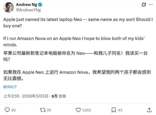 吴恩达也玩起了梗(他的两个孩子分别叫 Neo 和 Nova)。