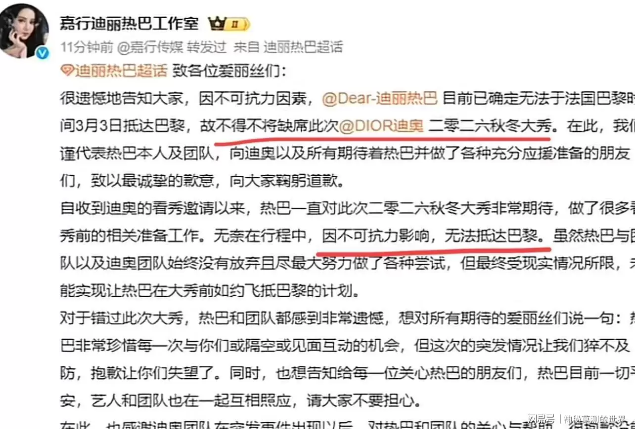 迪丽热巴滞留迪拜已超过七十二小时,并非网传的二十四小时。随着今天迪奥大秀开幕,消息实在瞒不住了,团队才不得已出来告知粉丝。否则,他们恐怕还会一直瞒下去。